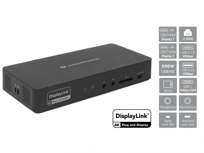 A Conceptronic DONN30B 13 az 1-ben Thunderbolt 4 dokkolóállomáson két Thunderbolt 4 port, egy HDMI-kimenet, 2,5 GbE-s Ethernet, két 10 Gbit/s-os USB-C és két, szintén 10 Gbit/s-os, USB-A port található. Mindemellett egy SD 4.0-s kártyaolvasó is helyet kapott UHS-II támogatással az akár 312 MB/s-os adatátvitelhez, ami különösen hasznos a folyamatosan úton lévő fotósoknak és alkotóknak.